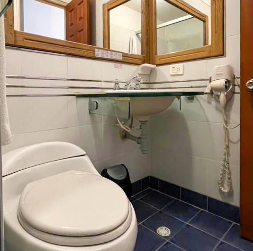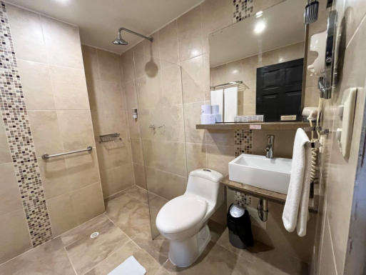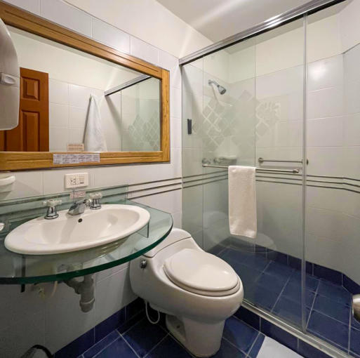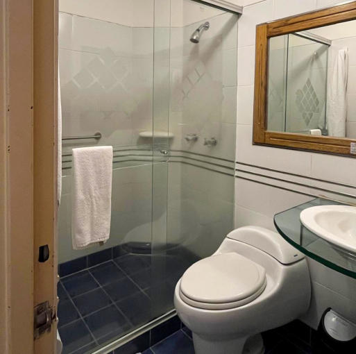 equipado, con ducha de vidrio templado, espejo amplio, toallas y amenidades de cortesía.